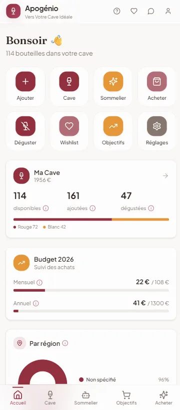 Vue d'ensemble de votre cave : statistiques, budget, actions rapides.